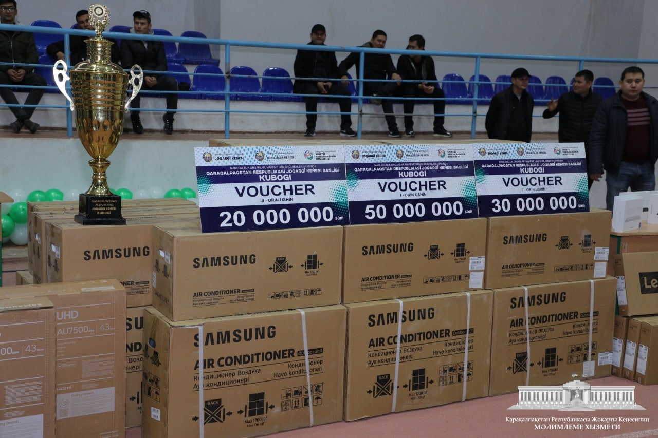 Жеңимпазларға сондай-ақ, «Қарақалпақстан Республикасы Жоқарғы Кеңеси Баслығының кубогы” медалы, телевизор ҳәм 50 млн сўм қаржылай сыйлықлар тапсырылды.